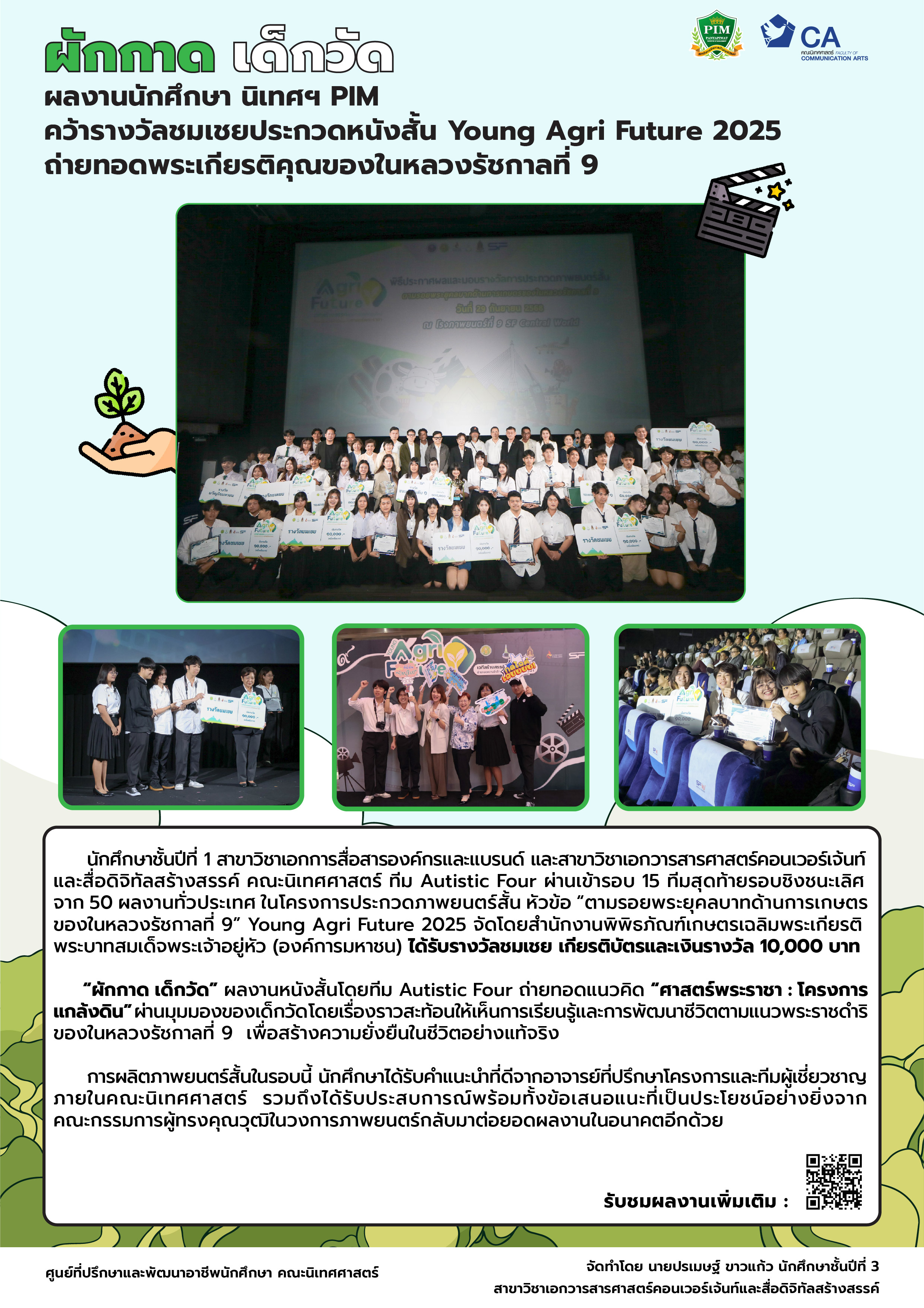 ผักกาดเด็กวัด ผลงานนักศึกษา นิเทศฯ PIM คว้ารางวัลชมเชยประกวดหนังสั้น Young Agri Future 2025 ถ่ายทอดพระเกียรติคุณของในหลวงรัชกาลที่ 9 ตุลาคม 21, 2025napatsanunamp napatsanunamp