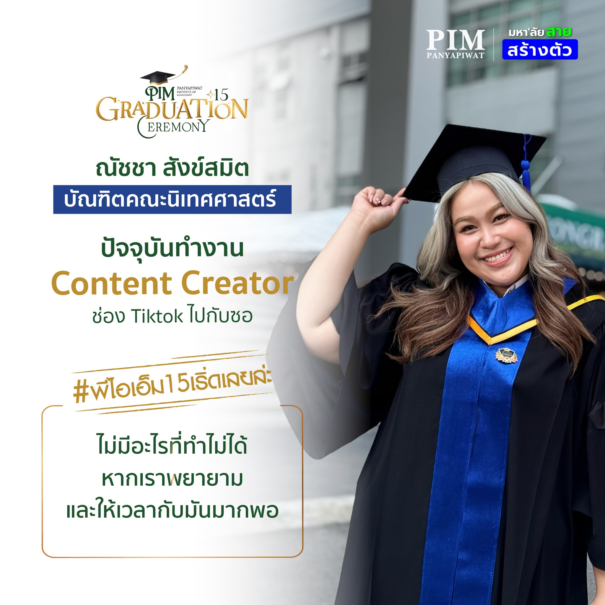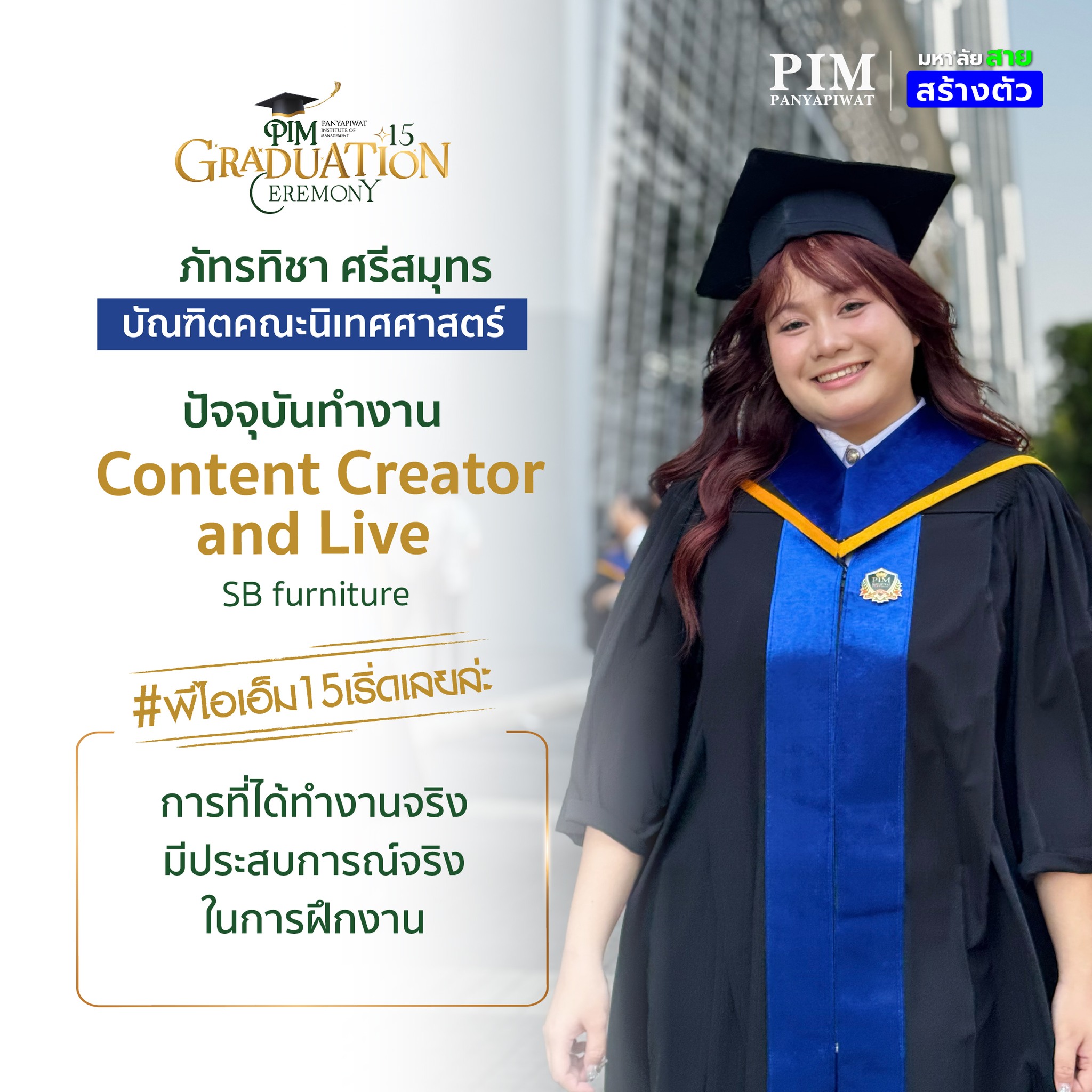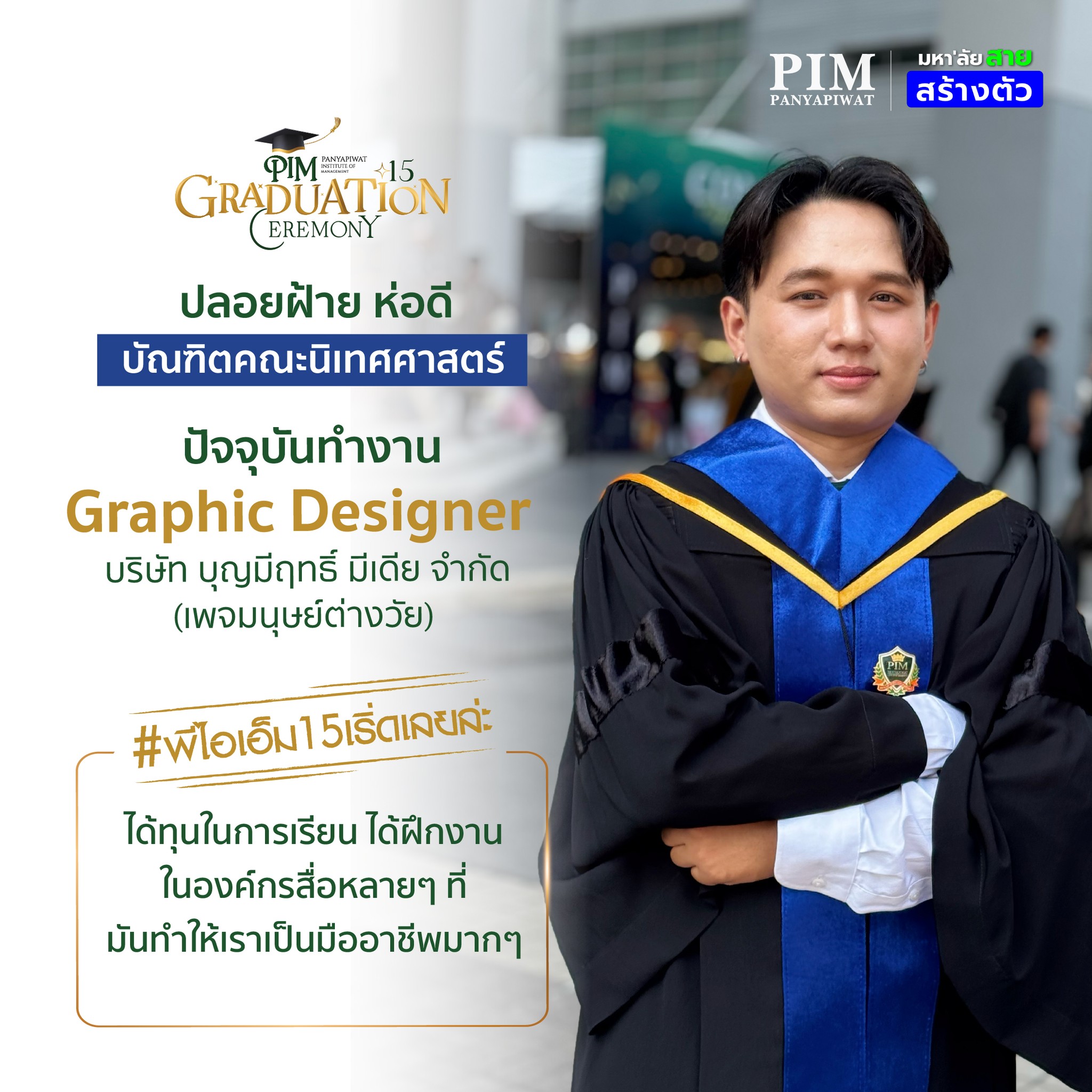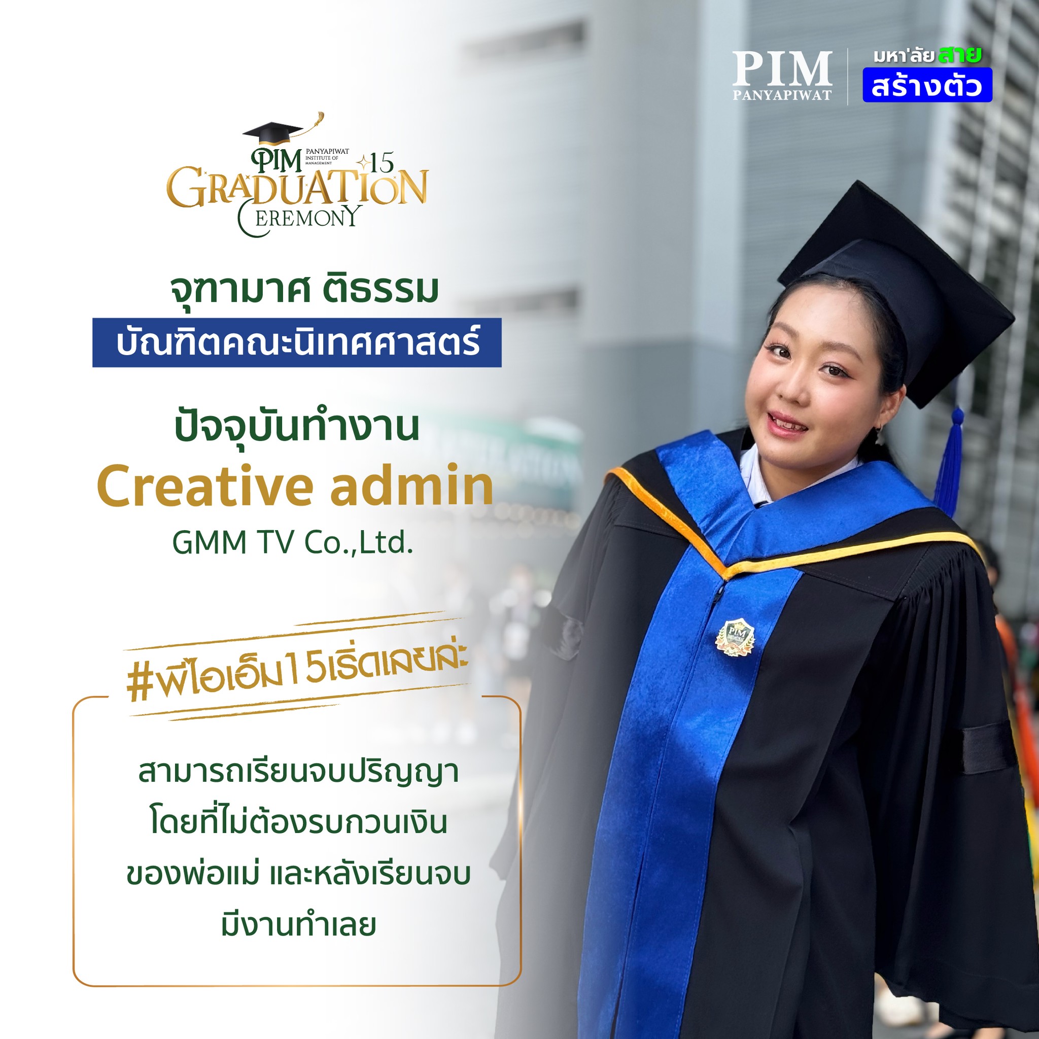 การเลือกมาเรียนที่นี่จะเป็นการตัดสินใจที่คุ้มค่าแน่นอน! ด้วยคุณภาพของอาจารย์ผู้สอนที่มากประสบการณ์ สถาบันที่พร้อมสนับสนุนในทุกด้าน และเครือข่ายพันธมิตรสถานประกอบการที่แข็งแกร่ง รวมถึงตัวพี่เองที่จบจากที่นี่ สามารถบอกได้เต็มปากว่า 4 ปีที่ PIM จะเป็นช่วงเวลาที่ให้อะไรกับเราอย่างมากมาย