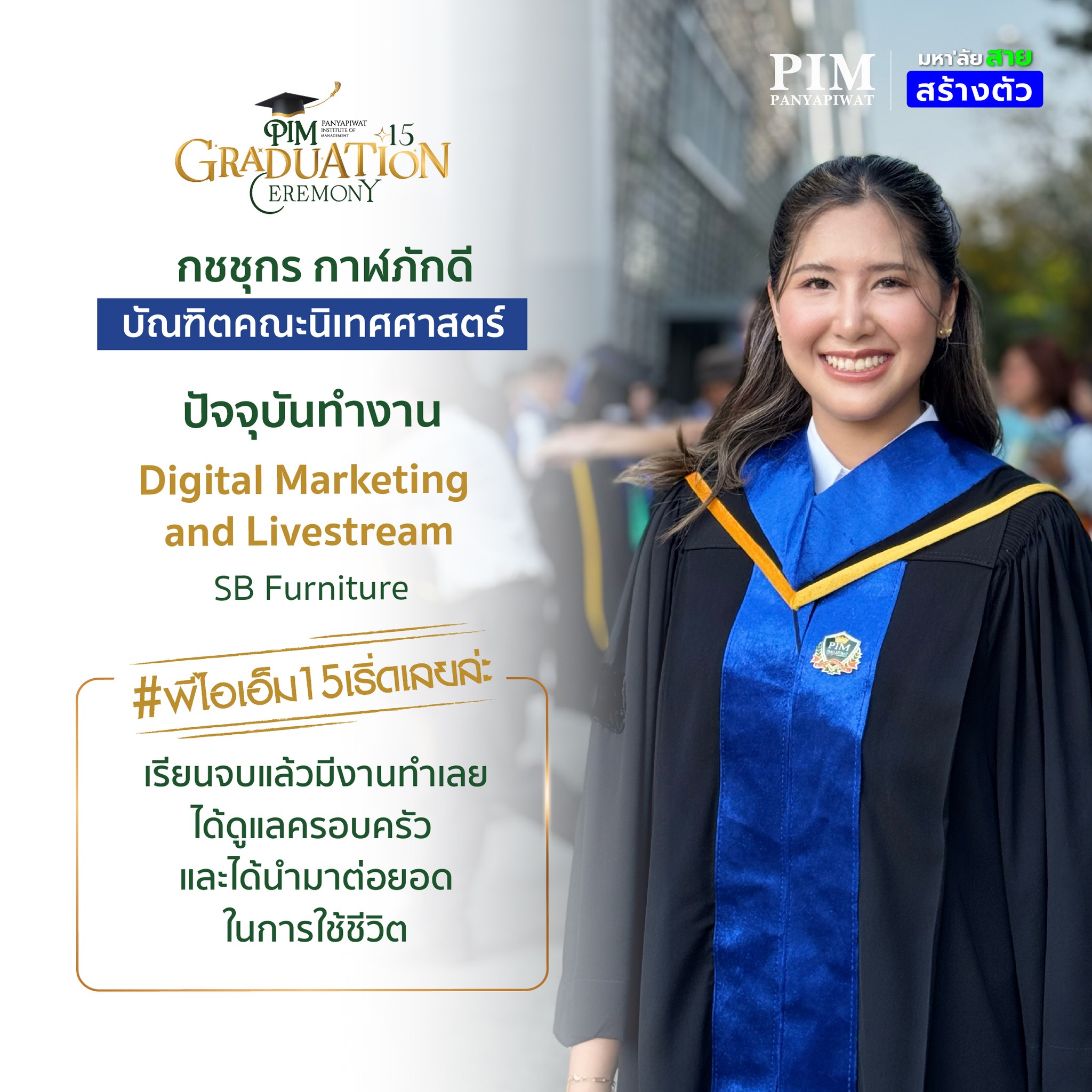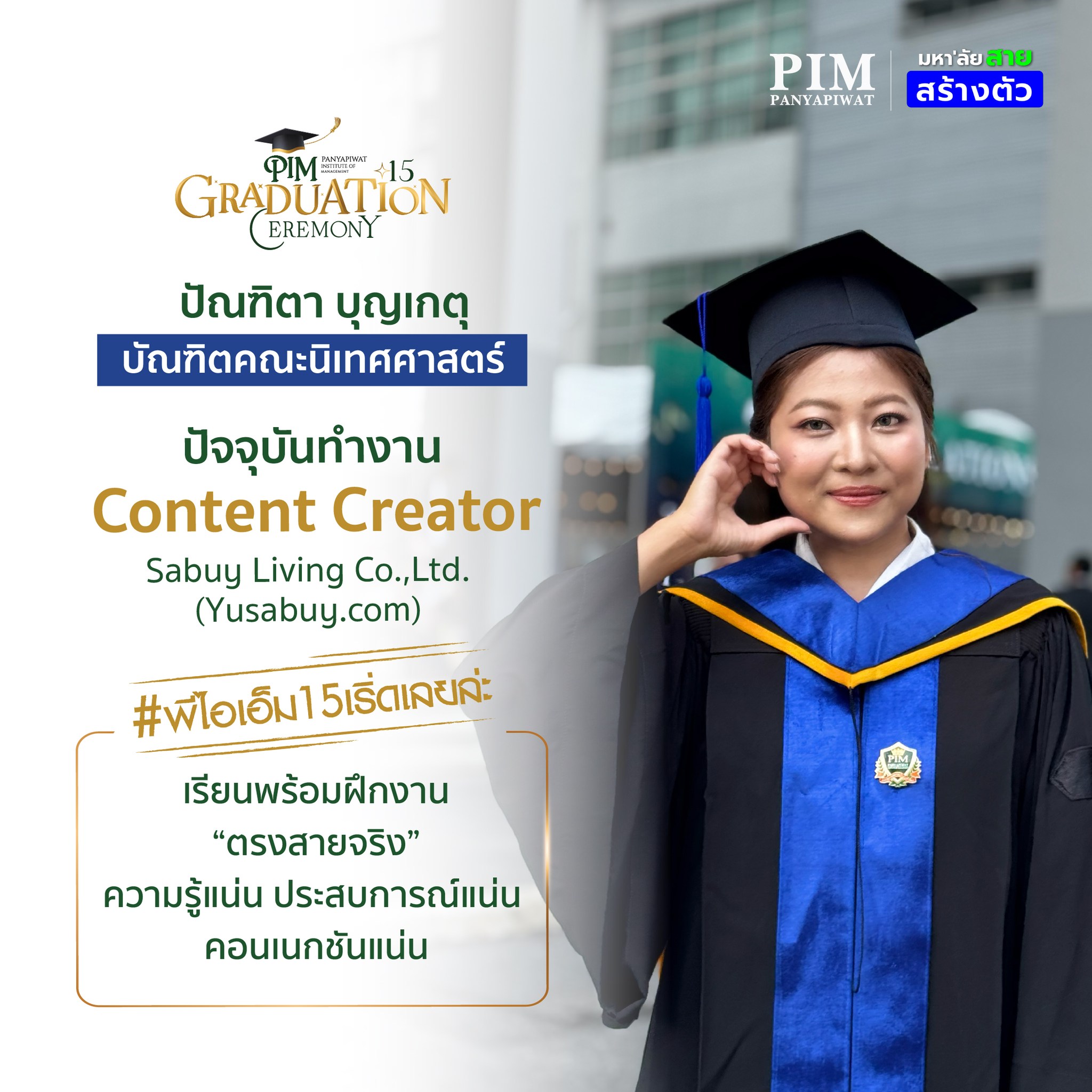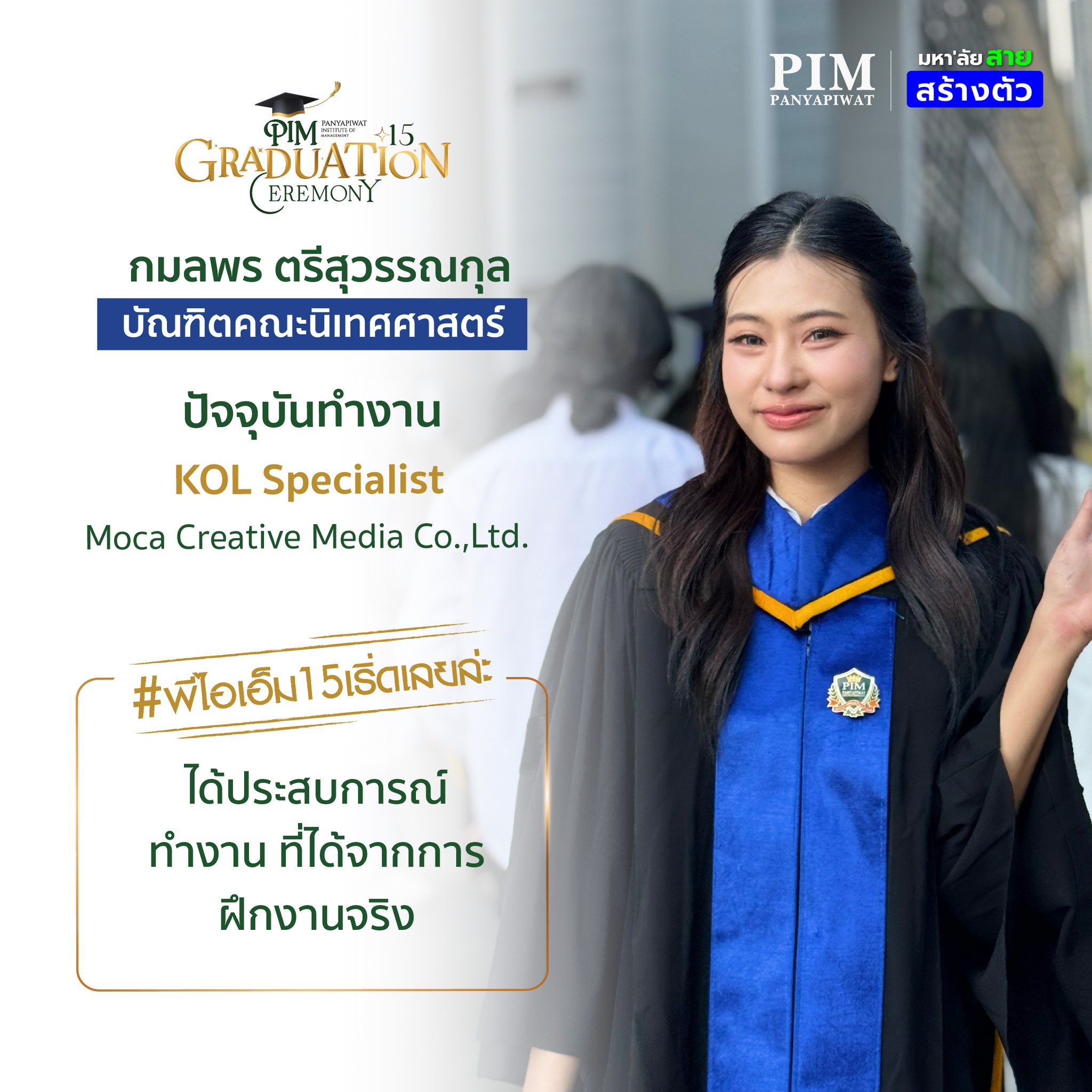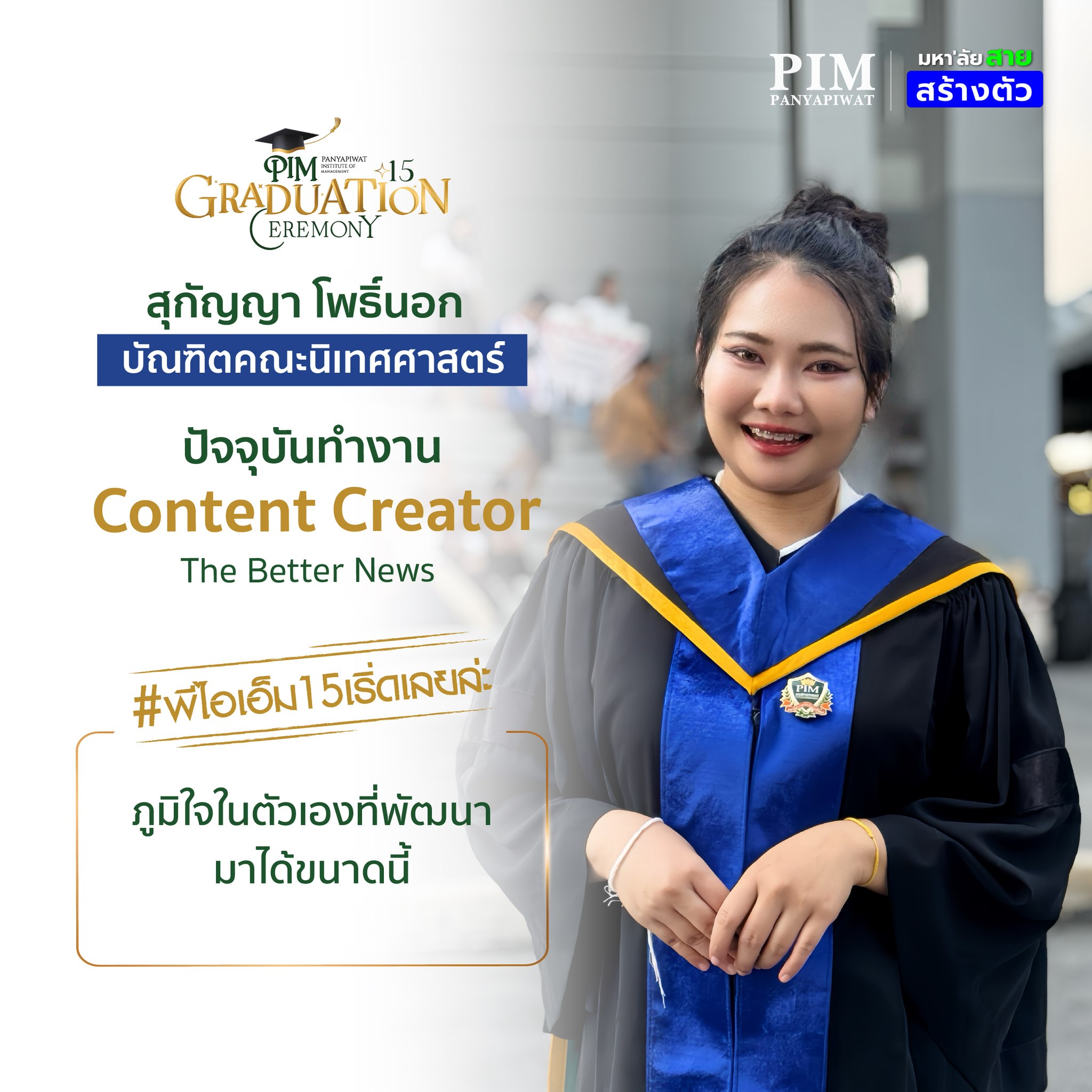 การเลือกมาเรียนที่นี่จะเป็นการตัดสินใจที่คุ้มค่าแน่นอน! ด้วยคุณภาพของอาจารย์ผู้สอนที่มากประสบการณ์ สถาบันที่พร้อมสนับสนุนในทุกด้าน และเครือข่ายพันธมิตรสถานประกอบการที่แข็งแกร่ง รวมถึงตัวพี่เองที่จบจากที่นี่ สามารถบอกได้เต็มปากว่า 4 ปีที่ PIM จะเป็นช่วงเวลาที่ให้อะไรกับเราอย่างมากมาย